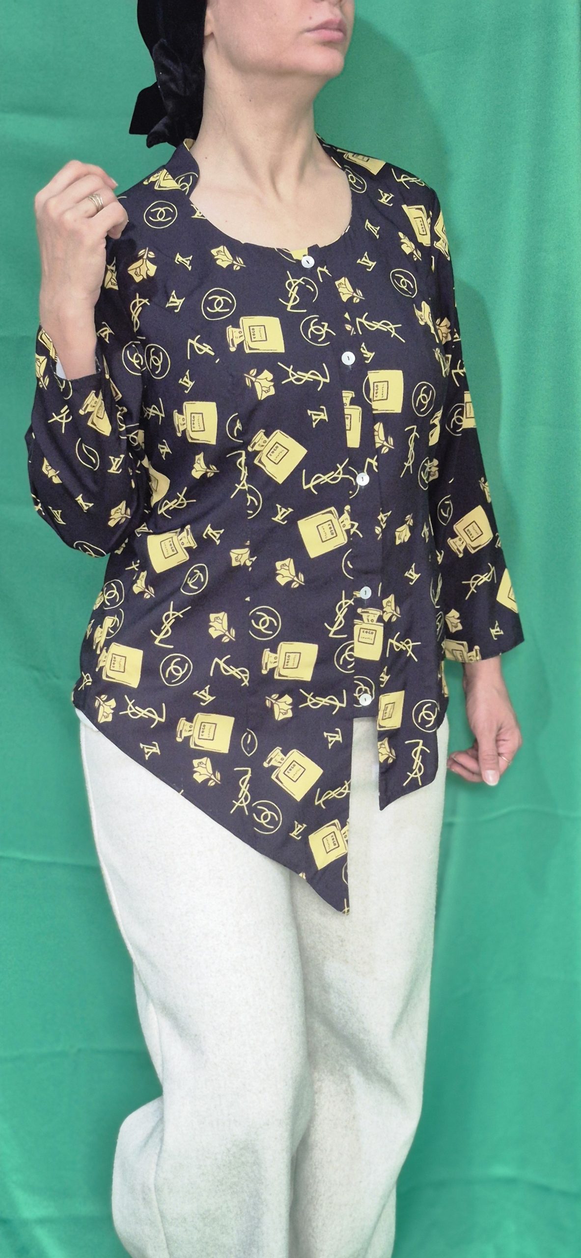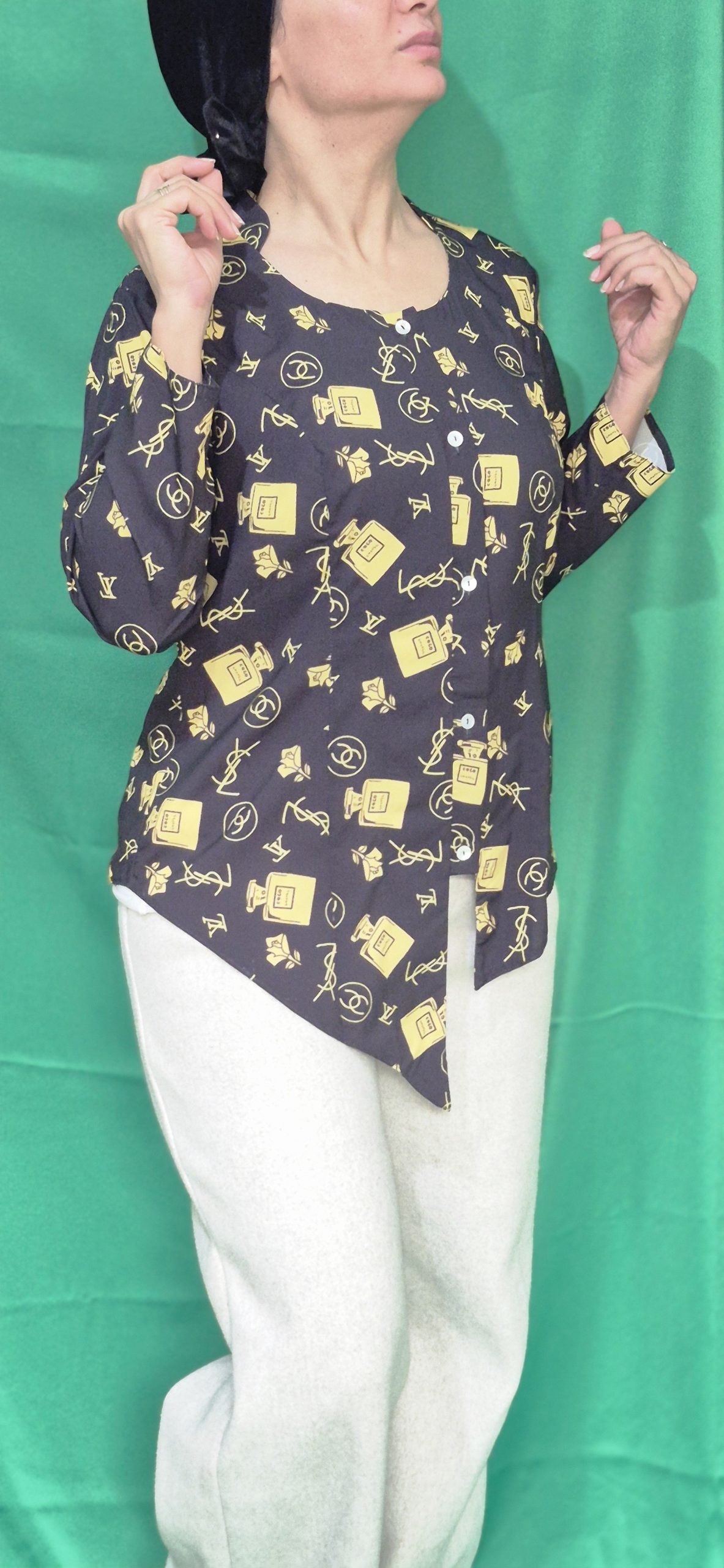 شومیز یقه گرد ،جلو دکمه خور ،آستین شمشیری ،مدل دار جلو کوتاه بلند