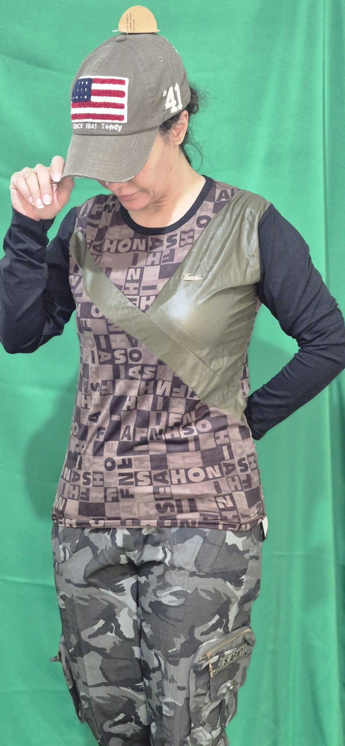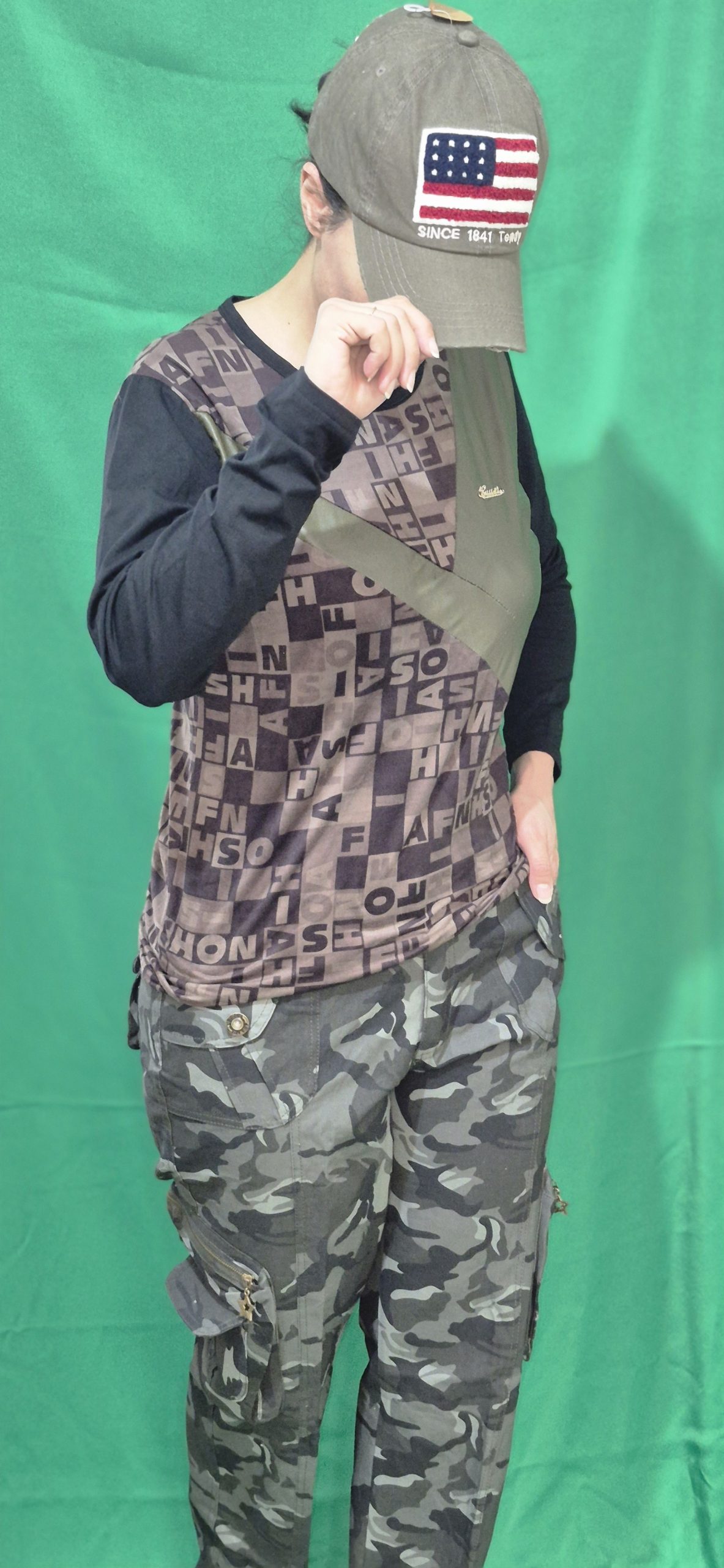 این ست دارای کلاه نقاب دار کتان ،تیشرت آستین دار چرم دوزی شده،شلوار ۶ جیب کماندویی