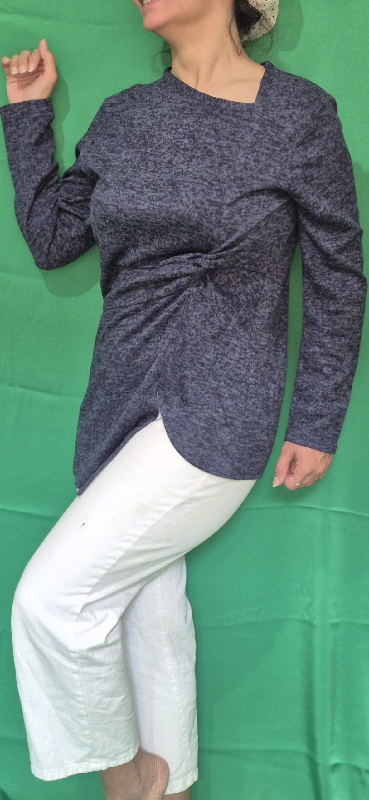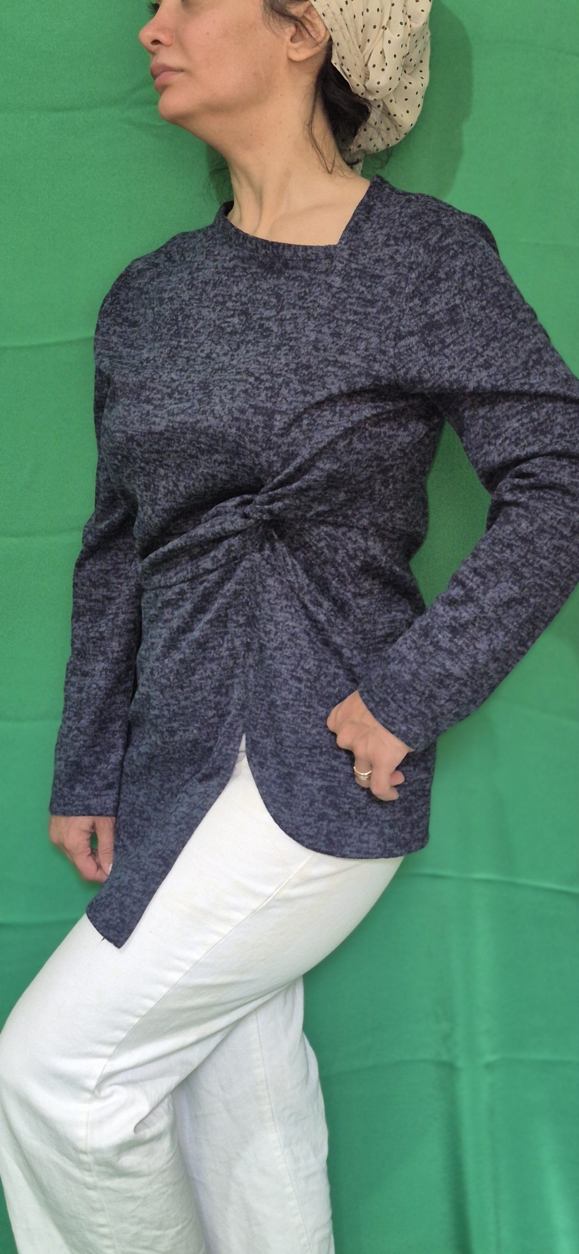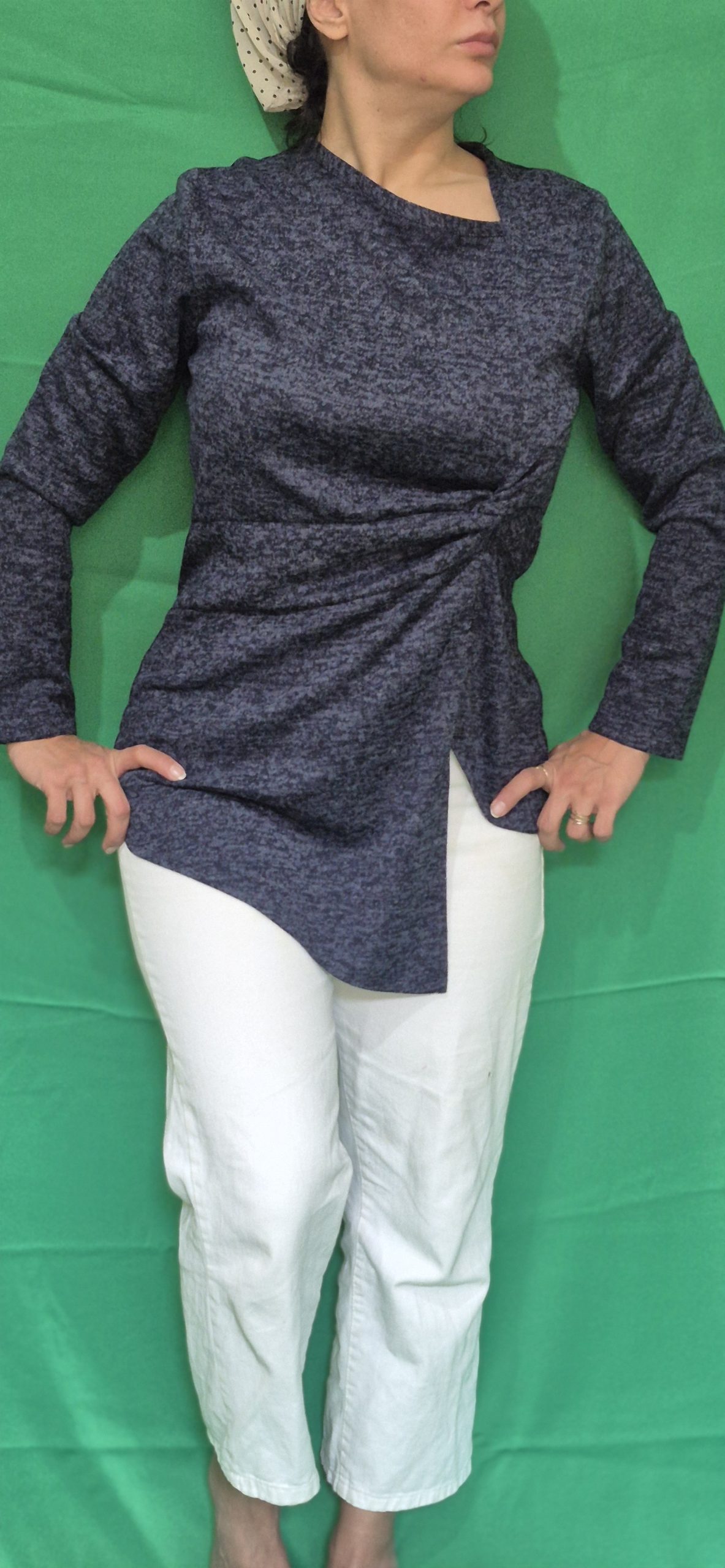 یقه کج،گره زیرسینه در پهلو سمت چپ،پایین شومیز سمت چپ هلال کوتاه و سمت راست نوک تیز بلند
